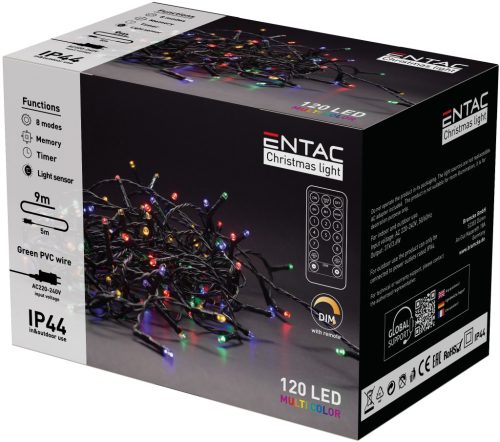 Entac Karácsonyi IP44 120 LED Füzér Színes 9m Távirányítóval