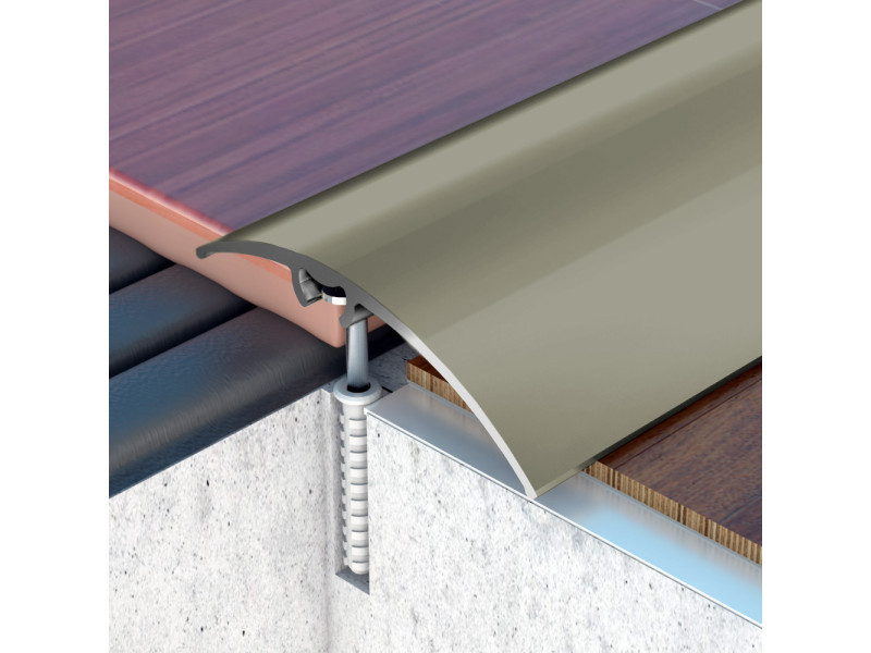 Ez a széles, 50 mm-es szintváltó profil tökéletes választás olyan helyiségekben, ahol különböző magasságú padlóburkolatok csatlakoznak egymáshoz – például laminált padló és hidegburkolat között. A rejtett rögzítés nemcsak stabil és biztonságos megoldást kínál, hanem a végeredmény is esztétikus, letisztult hatást kelt, látható csavarok vagy rögzítési pontok nélkül.