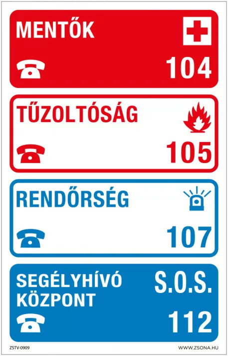 A tábla a legfontosabb magyar segélyhívó számokat jeleníti meg: