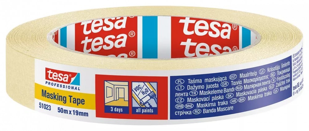 Termék leírása: A tesa Professional beltéri színelválasztó festőszalag egy különösen vékony, de erős papír hordozóból és akril ragasztóból áll. Ez a kombináció beltéri használat esetén 3 hónap után is nyomtalan eltávolítást tesz lehetővé. Segítségével lehetséges a borotvaéles színelválasztás, a festékmegfolyás pedig minimálisra csökkenthető. Magas kötőanyagú festékeknél (pl. latex) a teljes száradást meg kell várni a szalag használata előtt.