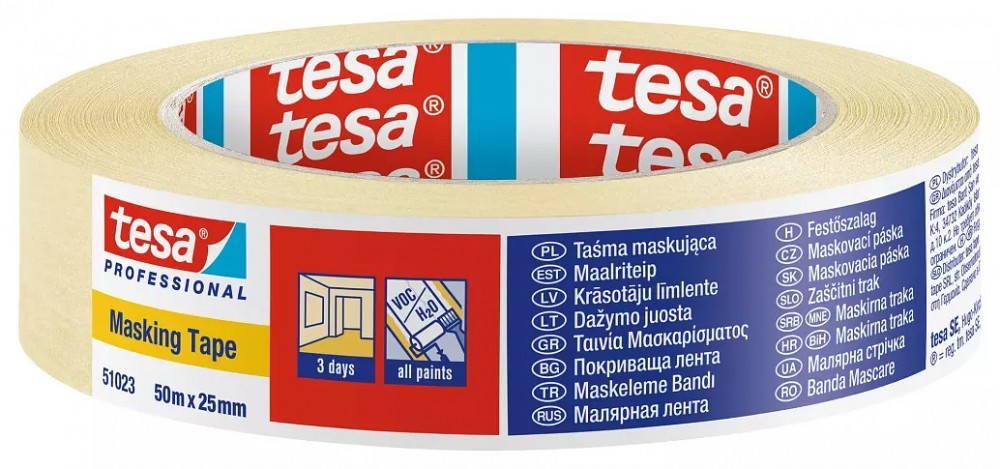 Termék leírása: A tesa Professional beltéri színelválasztó festőszalag egy különösen vékony, de erős papír hordozóból és akril ragasztóból áll. Ez a kombináció beltéri használat esetén 3 hónap után is nyomtalan eltávolítást tesz lehetővé. Segítségével lehetséges a borotvaéles színelválasztás, a festékmegfolyás pedig minimálisra csökkenthető. Magas kötőanyagú festékeknél (pl. latex) a teljes száradást meg kell várni a szalag használata előtt.